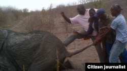 Another photo depicts villagers trying to help a mid-sized elephant to its feet. Villager Difa Dube, who captured the desperate pictures, said the situation is so dire around Bambadzi area that elephants have also started dying.