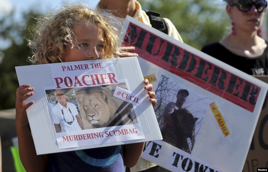 FILE - Protesters hold signs during a rally outside the River Bluff Dental clinic against the killing of a famous lion in Zimbabwe, in Bloomington, Minnesota, July 29, 2015.