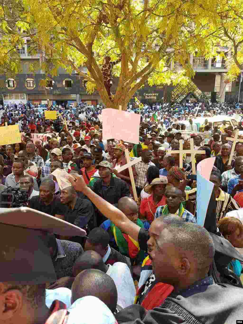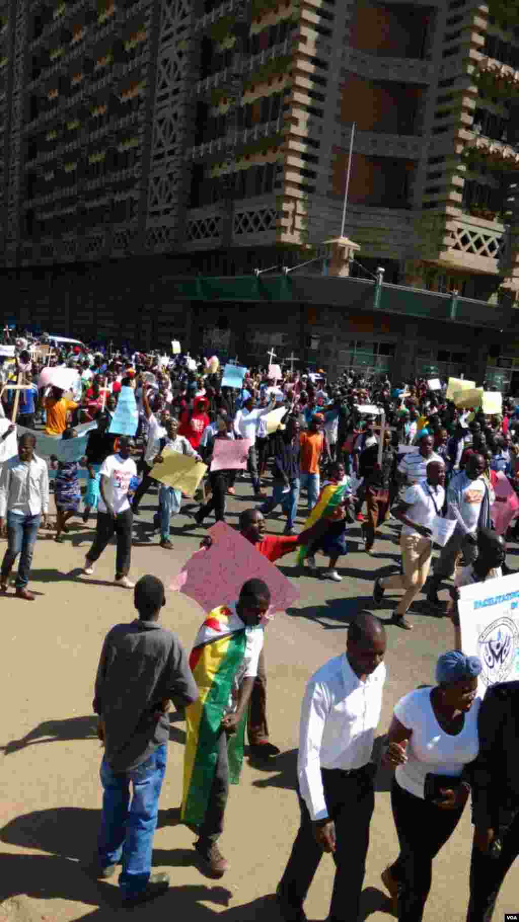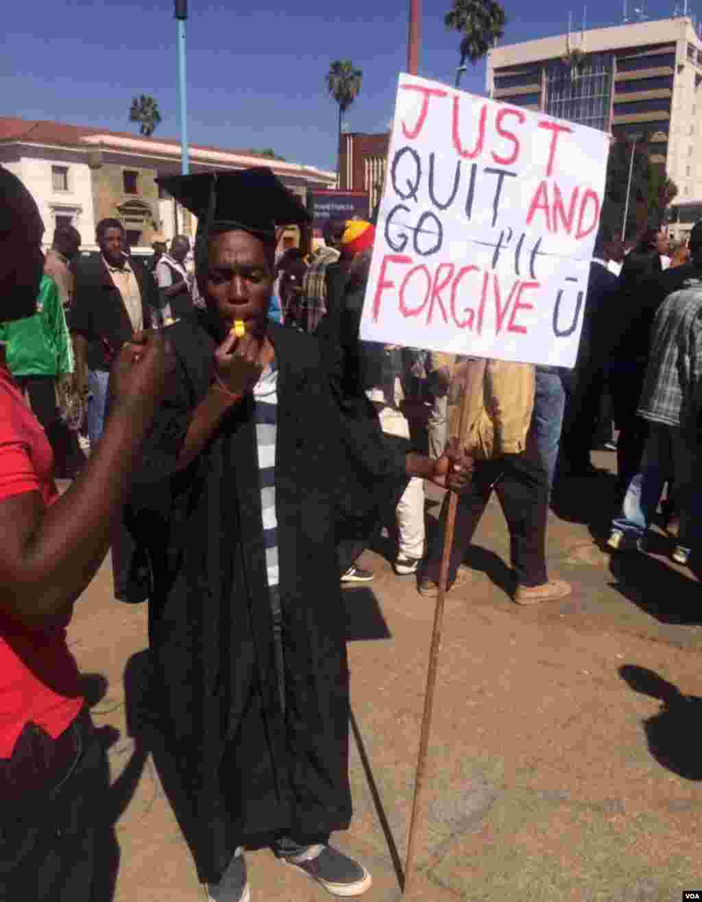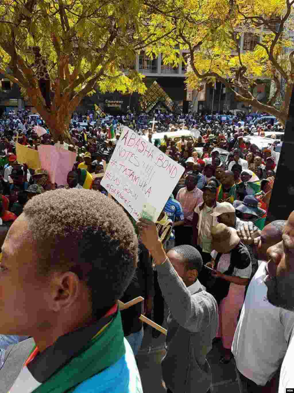 Police descended heavily on the protesters who were waving some placards inscribed “Mugabe Must Go’ and ‘No to Bond Notes’.